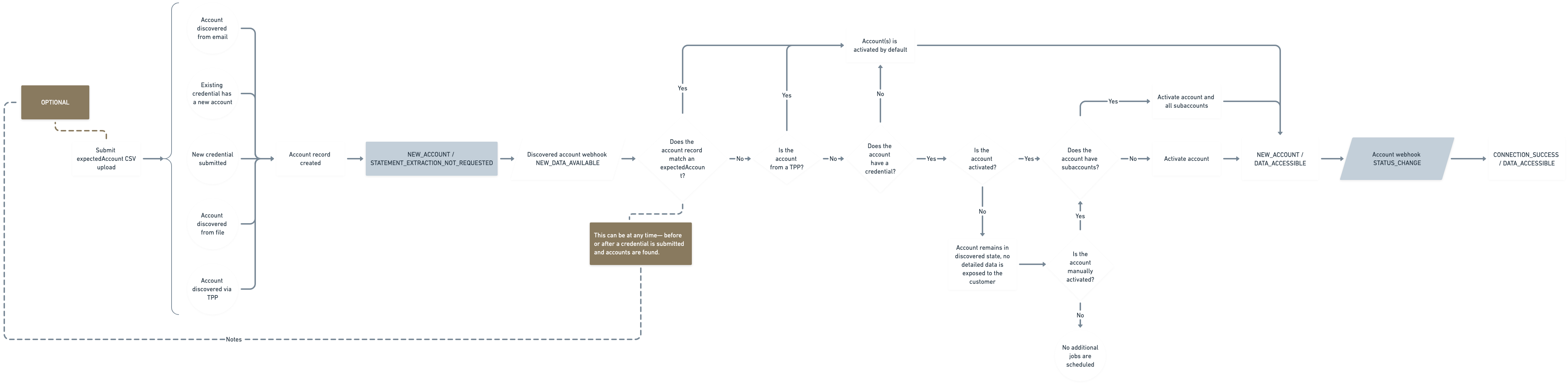 When you submit a credential, all associated accounts (normal, summary, and sub-accounts) are discovered through a Top-of-Stack (TOS) data pull and assigned status: NEW_ACCOUNT and statusDetail=STATEMENT_EXTRACTION_NOT_REQUESTED